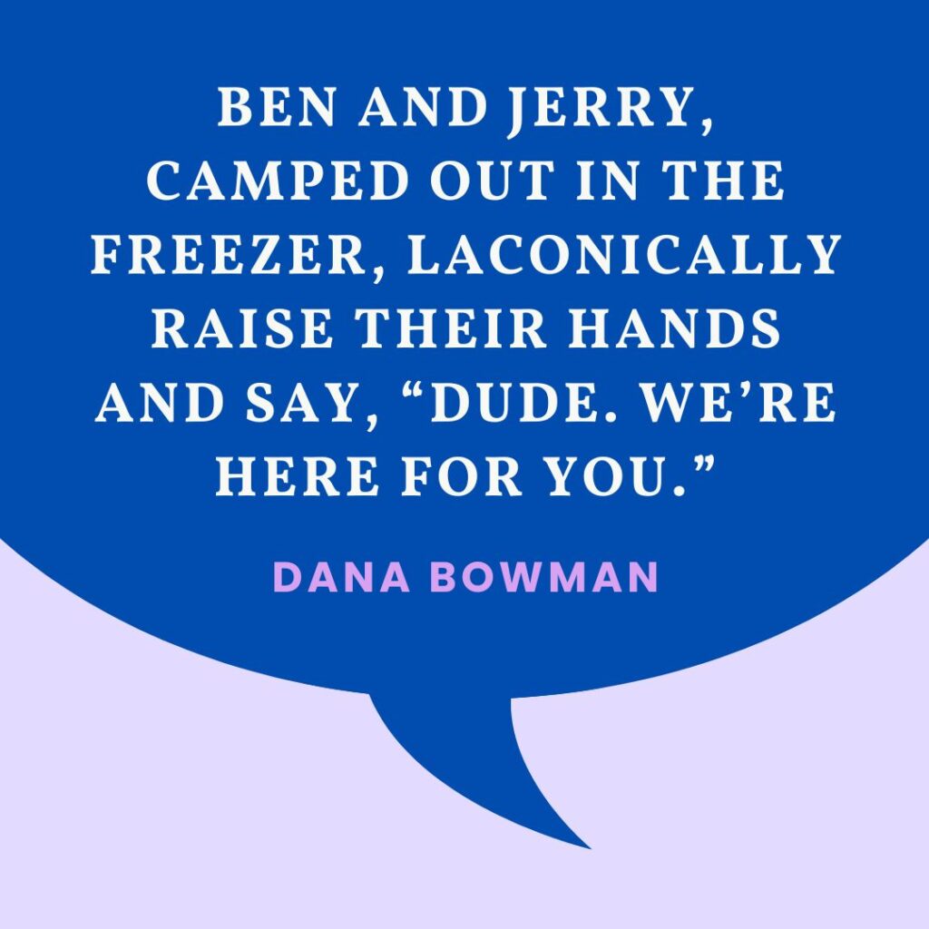 My binge starts in my brain. It has nothing to do with my stomach. There is no hunger, only feelings. The brain starts to feel stress and shifts in its seat, muttering, “Uh, I’m getting uncomfortable. Could we have some dopamine over here? I don’t do stress.” Ben and Jerry, camped out in the freezer, laconically raise their hands and say, “Dude. We’re here for you.” And my brain, always willing to go for the quickest option because it hates waiting, says, “Ah yes! That has always worked in the past! I have been grooving to this for ages. It is super effective.” Somewhere, buried deep in my prefrontal cortex, a bit of tired mumbling says, “Um, actually not so much really,” but after the first hit of sugar, my brain turns off. Like an old TV, it just clicks and the screen shudders to a pinprick of light, then black. Sugar pulls the plug. When the Snickers bar or the ice cream or the bagel hits my system, I don’t even get a groan of pleasure. There’s . . . nothing.